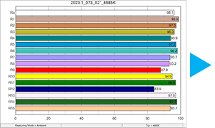 図6は天井照明を消灯し、Tino4000RA98Pを採用した色見台の照明環境をC-7000で測定したグラフです。平均演色評価数(Ra)は98.6というきわめて高い数値を示し、赤色の演色性を示すR9も94.7という高い数値を示しています。ところが、天井照明をつけた状態で色見台の照明環境を測定すると、図7のようにRaがやや低下し、R9は90を下回っています。今度は天井照明だけを測定すると、図8のようにRaは83.0と低く、R9はマイナスの数値、R12は約60と低い数値でした。このように、C-7000は、色評価の現場の課題を洗い出すのにきわめて有効なツールです。そして、Tino4000RA98Pは、演色性能の調整が可能なため、これらの測定データをもとに理想的な照明環境を実現することが可能です。