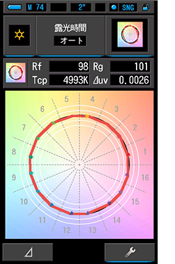 このような状況がある一方で、印刷業界の評価基準を策定する日本印刷学会は、より高度な演色性評価基準であるTM-30に関心を持っています。そして、GPSEはその普及に向けて取り組んでいます。TM-30は北米照明学会で定められている国際規格で、CRIの15色に対して、TM-30ではより網羅的に99色のカラーサンプルが使用されます。そのため、様々な色が使用される印刷業界において、より適切な評価基準ということができます。TM-30には、色の忠実性を見るための指標のRfと光源のもつ鮮やかさ(彩度)の指標Rg が有ります。Rfは0~100、Rgは0~200の数値で示されます。Rfが100なら基準光源と同じ理想的な忠実性(演色性)です。Rgが100より低ければ彩度が低いためくすんだ色に見え、100より高ければ彩度が高いため鮮やかな色に見えます。このように、TM-30はより高度な評価基準ですが、C-7000ではCRIと同様の簡単な操作でTM-30の数値やグラフを確認することができます。下の図13はC-7000のTM-30表示モードの画面です。Rf、Rgの数値とTM-30のグラフが一画面に納められています。グラフの黒い円は理想的なRgを示し、赤い円は測定したRgの高低を示します(図13の測定結果はRgが100に近いため、黒い円が赤い円でほとんど隠れています)。赤い円が黒い円の内側にある場合はRgが低い(彩度が低い)ことを示し、赤い円が黒い円の外側にある場合はRgが高い(彩度が高い)ことを示しています。黒い円と赤い円を結ぶ矢印の線が円の中心からずれている場合、色相がずれていることを示しています。(図14、図15で青く囲った部分がグラフの矢印です。)
