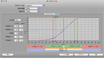 フィルムと違いデジタルカメラは機種やソフトウェアによって再現性が変わってきます。露出プロファイル機能は、それぞれのデジタルカメラの再現可能な領域を露光域としてグラフ、数値化しプロファイルすることができます。