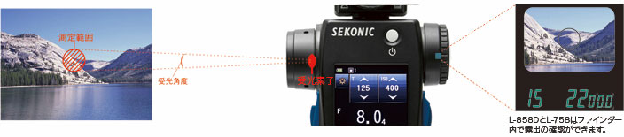 L-858D、L-758シリーズの1゜スポット測光を使うことでピンポイントでの露出測定が可能となります。入射光測定と併用することで基準となる測定値との露出差を把握することができ、写真全体のイメージコントロールが可能になります。