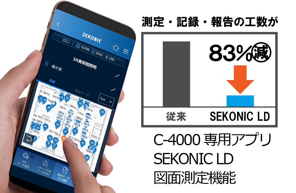 分光式の高精度な測定を、記録・報告までシームレスにつなげる分光色彩照度計C-4000専用アプリ「SEKONIC LD」。便利な「図面測定機能」を搭載した有償プランの3か月無料キャンペーンを実施します。このアプリは、照明デザイナー様、施工業者様が現場で抱える「測定~報告」にまつわるお悩みを根本から解決します。製品情報はこちら。