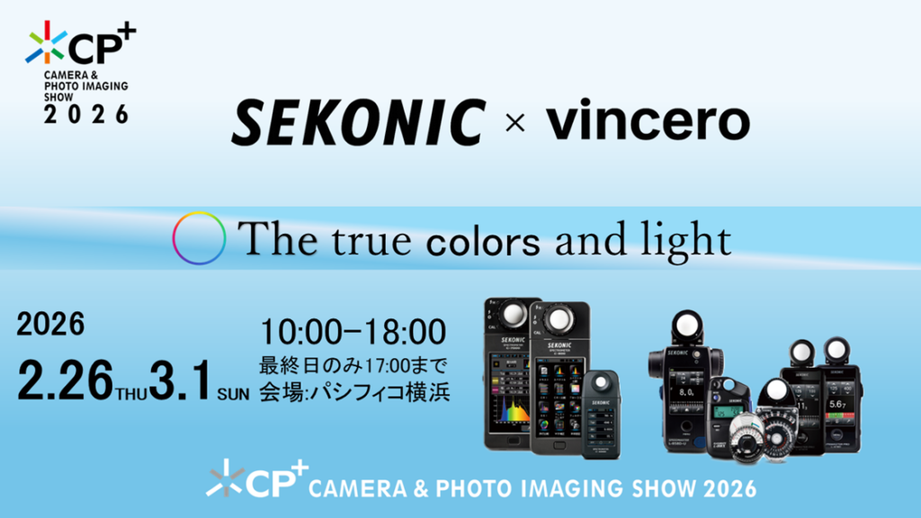 株式会社セコニックは2026年2月26日(木)~3月1日(日)の期間、パシフィコ横浜で開催される「CP+2026」に株式会社ヴィンチェロと合同出展いたします。セコニック/ヴィンチェロブースでは、露出計やカラーメーター、株式会社ヴィンチェロの取扱製品をお手に取って体験することができます。またブース内では第一線で活躍するフォトグラファーによるセミナーやデモンストレーション開催いたします。ぜひCP+2026セコニック/ヴィンチェロブースにお立ち寄りください。